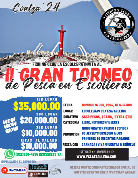 Participa en la competencia más épica de Pesca en Escolleras del Sur de México, en donde las fabulosas escolleras de Coatzacoalcos serán el marco perfecto para recibir a grandes pescadores altamente competitivos del pais, empleando sus mejores secretos de pesca, para lograr llevarse una bolsa garantizada de $65,000.00 pesos, y sin olvidarnos de los "salados", para ellos al final del torneo haremos unas rifas de señuelos y combos de pesca.. con valor de $10,000.00 pesos Inscribete ya!